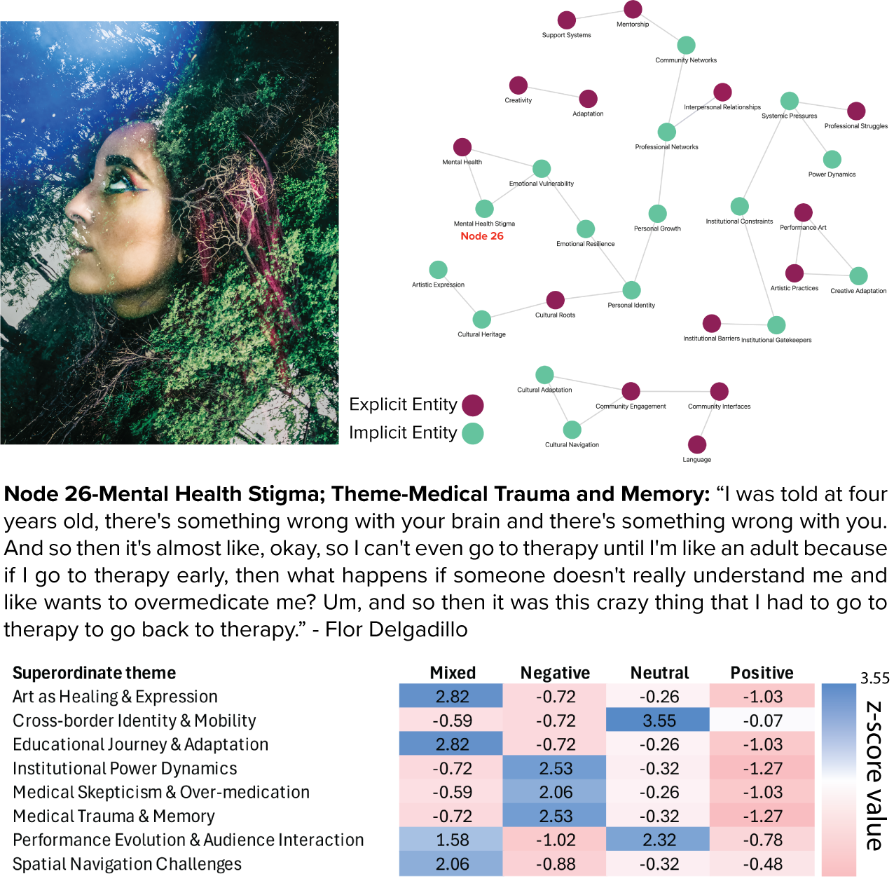 Example portrait exemplifying network nodes and thematic-sentiment relationships. Left: Portrait of participants. Right: Representational network consisting of explicit and implicit entities. Middle: Excerpts from the interview session associated with the node entity and portrait. Bottom: Heatmap visualizing z-scores from a Chi-Square Test of Independence (theme × sentiment) relationships. Positive z-scores reflect sentiment–theme pairings that occurred more than expected; negative z-scores reflect underrepresentation. Values ≥ |1.96| indicate statistical significance.